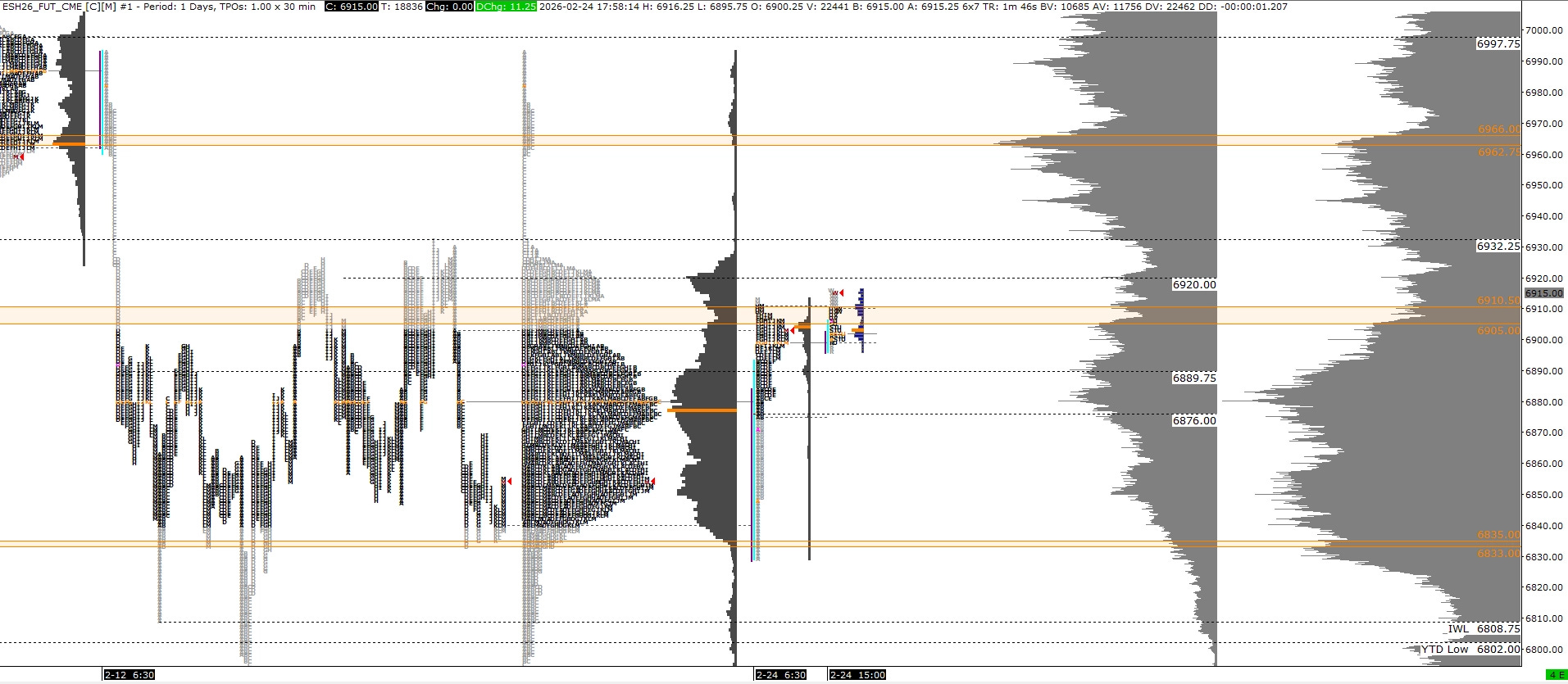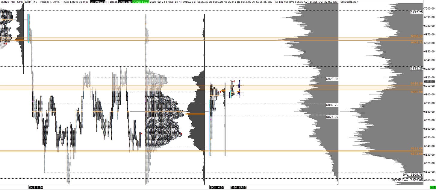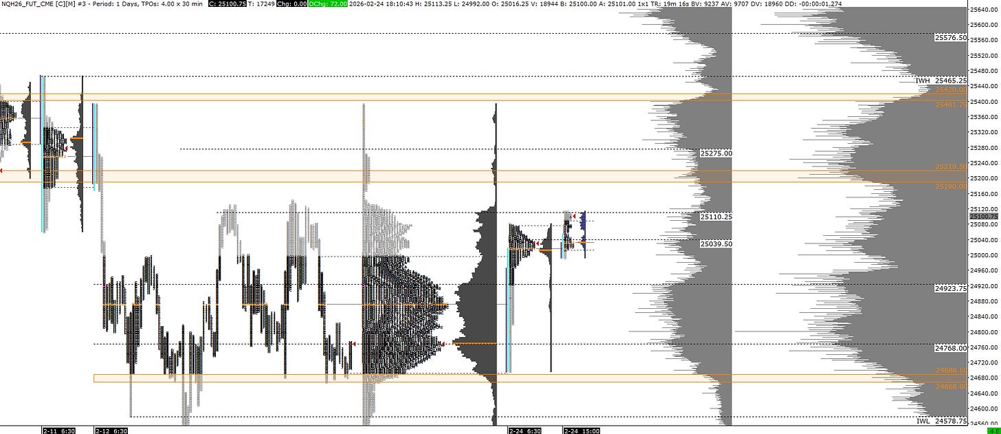 Main focus for tomorrow is 25040 and 25110. Upper most shelf yesterday and upper most shelf of recent balance respectively. Acceptance above and we look for the rest of the single prints from 02/12 to get filled. The AVWAP off the ATH also sits here. Continued strength and acceptance beyond this can put buyers in control again. Below this and back into yesterday’s range becomes trouble for buyers. Likely another rotation back down. Within yesterday’s range, watching 24920s as a pivot.